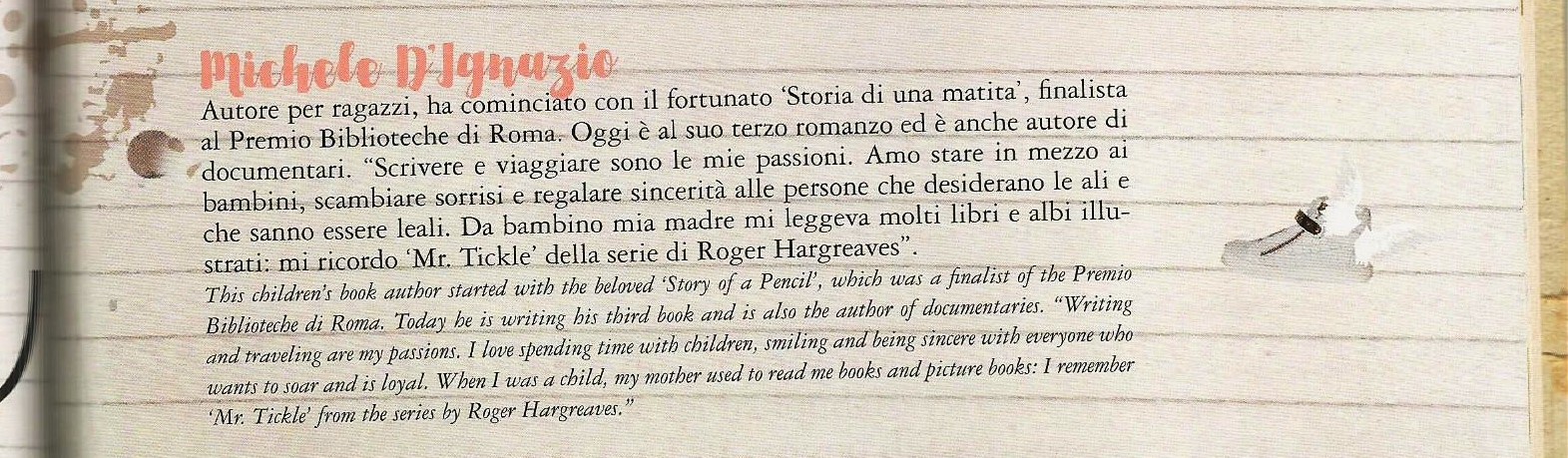 michele-dignazio_il-sorriso4-copia Published settembre 21, 2016 at 1571 × 459 in Il Sorriso ‹ Return to post Lascia un commento Cancella risposta Δ Il mio segno particolare Il mio segno particolare Tra libri e mare Articoli recenti Felice e l’invenzione del mare Video: La gita al pastificio Pastello (Estratto dal libro “Storia di una matita. A casa”) Parole-conchiglia e altri giochi lessicali Fate i tuoni – Scatenate tempesta, seminate poesia Per chi volesse una copia di “Il secondo lavoro di Babbo Natale” in ucraino Categorie Il Vicolo (8) Libri (36) Pacunaimba (3) Per la scuola (12) Percorsi di Lettura (34) Storia di una matita (7) Traduzioni (1) Segui il blog via email Inserisci il tuo indirizzo email per seguire questo blog e ricevere notifiche di nuovi messaggi via e-mail. Indirizzo email: Iscriviti Il secondo lavoro di Babbo Natale Il secondo lavoro di Babbo Natale Search for... Ricerca Commenti recenti Italiano in Festa: C… su Fate i tuoni – Scatenate…Italiano in Festa: C… su Il Mio Segno ParticolareItaliano in Festa: C… su La trilogia di Babbo Nata…Italiano in Festa: C… su La trilogia di “Storia d…Lorenzo su Il Mio Segno Particolare: podc… Archivi settembre 2025 ottobre 2024 febbraio 2024 novembre 2023 ottobre 2022 luglio 2022 Maggio 2022 febbraio 2022 dicembre 2021 settembre 2021 Maggio 2021 gennaio 2021 dicembre 2020 ottobre 2020 settembre 2020 luglio 2020 Maggio 2020 aprile 2020 marzo 2020 gennaio 2020 Maggio 2019 marzo 2019 febbraio 2019 gennaio 2019 dicembre 2018 novembre 2018 agosto 2018 Maggio 2018 marzo 2018 febbraio 2018 gennaio 2018 dicembre 2017 novembre 2017 settembre 2017 giugno 2017 aprile 2017 febbraio 2017 gennaio 2017 ottobre 2016 settembre 2016 luglio 2016 Maggio 2016 febbraio 2016 gennaio 2016 ottobre 2015 settembre 2015 Maggio 2015 aprile 2015 febbraio 2015 gennaio 2015 Meta Crea account Accedi Flusso di pubblicazione Feed dei commenti WordPress.com