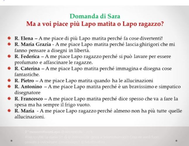 TwLapo_Domande Published novembre 24, 2017 at 687 × 531 in TwLapo ‹ Return to post Lascia un commento Cancella risposta Δ Il mio segno particolare Il mio segno particolare Tra libri e mare Articoli recenti Felice e l’invenzione del mare Video: La gita al pastificio Pastello (Estratto dal libro “Storia di una matita. A casa”) Parole-conchiglia e altri giochi lessicali Fate i tuoni – Scatenate tempesta, seminate poesia Per chi volesse una copia di “Il secondo lavoro di Babbo Natale” in ucraino Categorie Il Vicolo (8) Libri (36) Pacunaimba (3) Per la scuola (12) Percorsi di Lettura (34) Storia di una matita (7) Traduzioni (1) Segui il blog via email Inserisci il tuo indirizzo email per seguire questo blog e ricevere notifiche di nuovi messaggi via e-mail. Indirizzo email: Iscriviti Il secondo lavoro di Babbo Natale Il secondo lavoro di Babbo Natale Search for... Ricerca Commenti recenti Italiano in Festa: C… su Fate i tuoni – Scatenate…Italiano in Festa: C… su Il Mio Segno ParticolareItaliano in Festa: C… su La trilogia di Babbo Nata…Italiano in Festa: C… su La trilogia di “Storia d…Lorenzo su Il Mio Segno Particolare: podc… Archivi settembre 2025 ottobre 2024 febbraio 2024 novembre 2023 ottobre 2022 luglio 2022 Maggio 2022 febbraio 2022 dicembre 2021 settembre 2021 Maggio 2021 gennaio 2021 dicembre 2020 ottobre 2020 settembre 2020 luglio 2020 Maggio 2020 aprile 2020 marzo 2020 gennaio 2020 Maggio 2019 marzo 2019 febbraio 2019 gennaio 2019 dicembre 2018 novembre 2018 agosto 2018 Maggio 2018 marzo 2018 febbraio 2018 gennaio 2018 dicembre 2017 novembre 2017 settembre 2017 giugno 2017 aprile 2017 febbraio 2017 gennaio 2017 ottobre 2016 settembre 2016 luglio 2016 Maggio 2016 febbraio 2016 gennaio 2016 ottobre 2015 settembre 2015 Maggio 2015 aprile 2015 febbraio 2015 gennaio 2015 Meta Crea account Accedi Flusso di pubblicazione Feed dei commenti WordPress.com