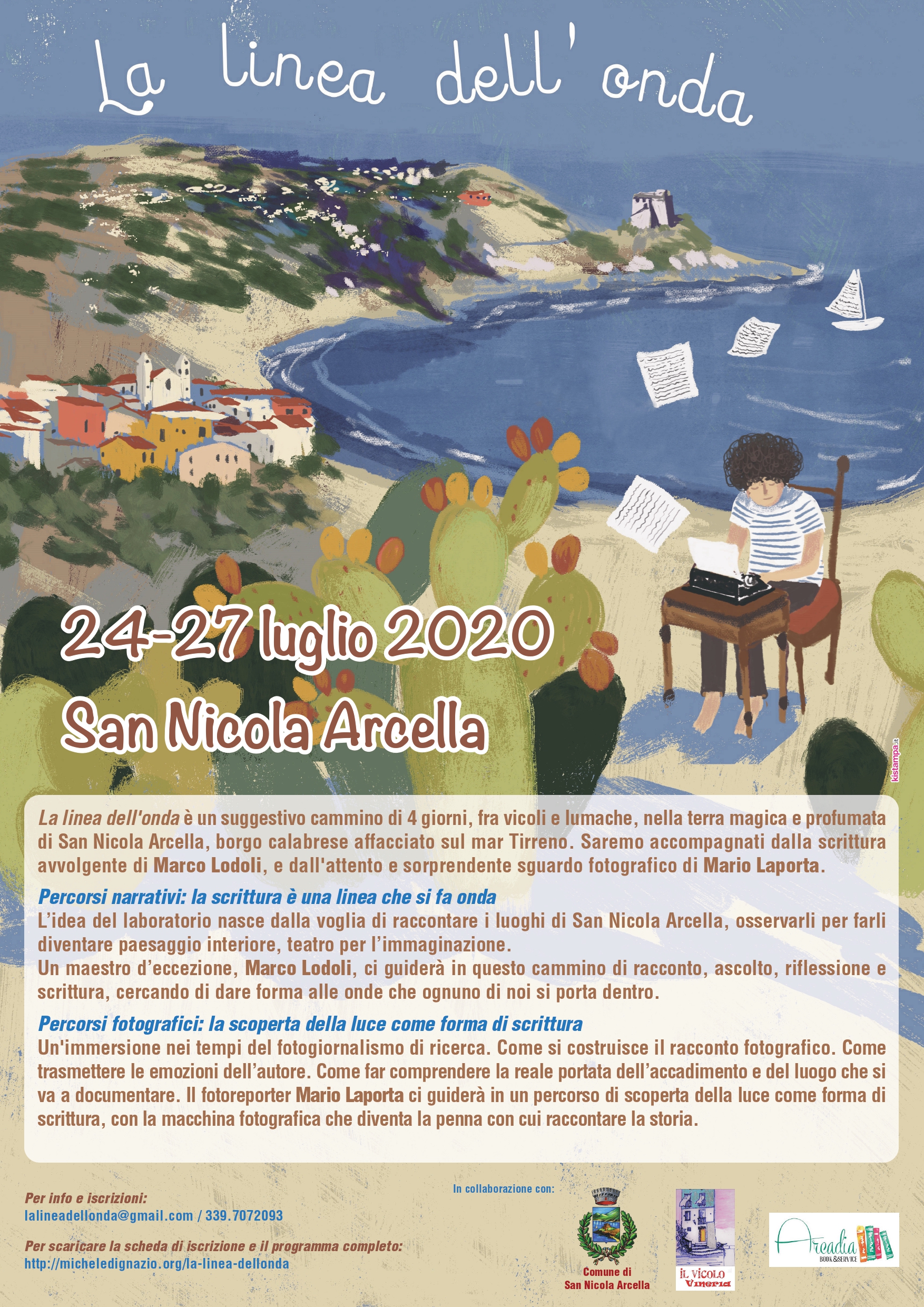Si svolgeranno nella cornice del mare e del borgo di San Nicola Arcella, dal 24 al 27 luglio, quattro giornate dedicate alla scrittura e alla fotografia. L’iniziativa si chiama “La linea dell’onda” ed è organizzata dallo scrittore Michele D’Ignazio e dalla sceneggiatrice e regista Giulia Merenda, con il patrocinio del Comune di San Nicola Arcella. Gli ospiti dei primi incontri saranno lo scrittore Marco Lodoli e il fotoreporter Mario Laporta.