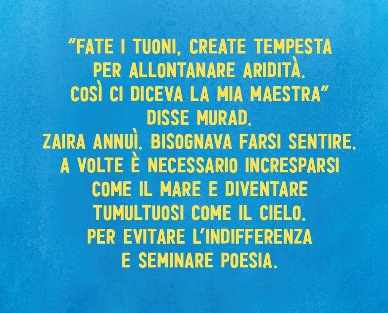 “Abbandono” era una parola-conchiglia, una di quelle parole che, a poggiarci l’orecchio, scopri che contiene in sé il suono dolce di un’altra parola. A Zaira piacevano molto e ne faceva la collezione.