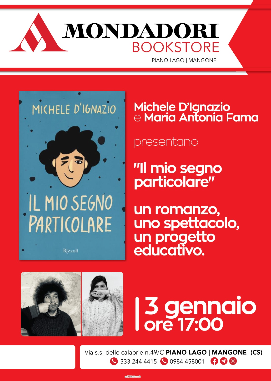 3 Gennaio 2023: Piano Lago, libreria Mondadori, presentazione di “Il mio segno particolare”: un romanzo, uno spettacolo, un progetto pedagogico. Insieme a Maria Antonia Fama (scarica la locandina)