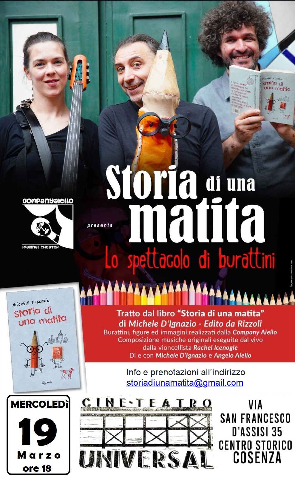 Mercoledì 19 marzo: Cosenza, Cineteatro Universal, ore 18, spettacolo di burattini di “Storia di una matita”. Per info e prenotazioni: micheledignazio@gmail.com