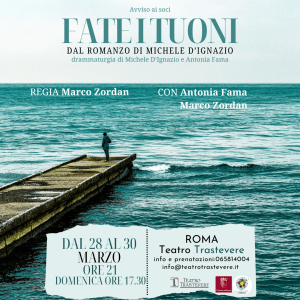 Dal 28 al 30 marzo: Roma, Teatro Trastevere, spettacolo teatrale di “Fate i tuoni” (ore 21, la domenica ore 17.30). Per info e prenotazioni: info@teatrotrastevere.it o micheledignazio@gmail.com